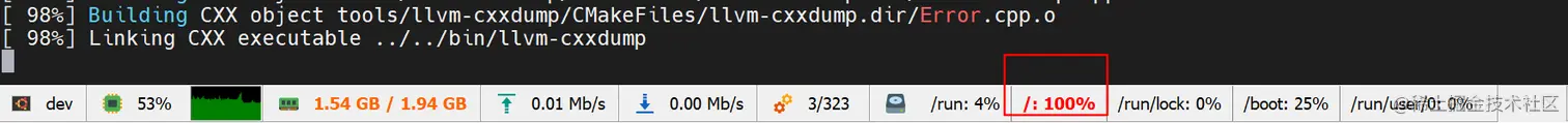- 首先是现象,前几次编译,基于LLVM最新版本总是编译到一半就失败,有一次切换到3.8版本反而成功了。这次找到原因是磁盘空间不够。