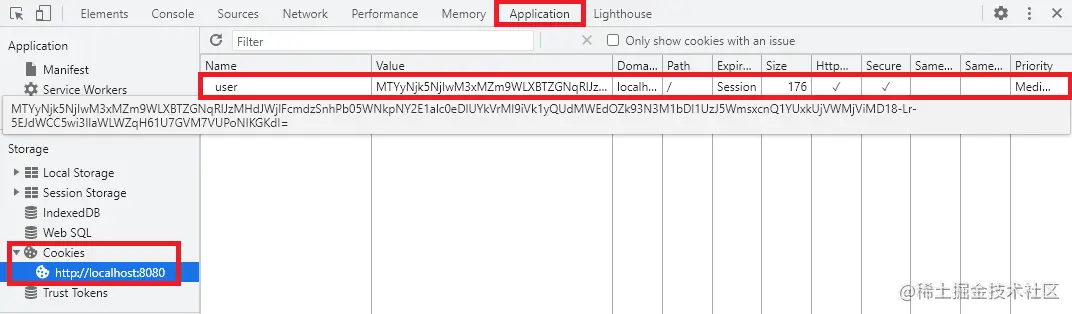 首先使用浏览器访问localhost:8080/set_cookie,这时可以在 Chrome 开发者工具的 Application 页签中看到 cookie 内容: