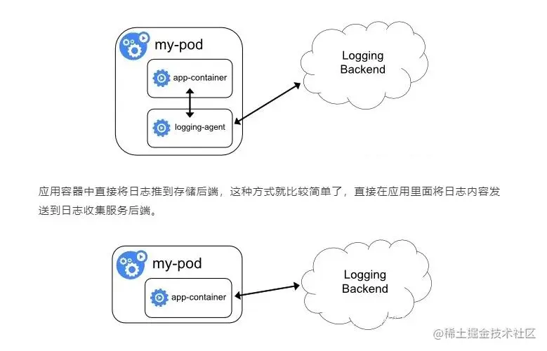 另一种是每一个Pod中都起一个日志收集agent(比如Logstash或Fluebtd)也就是相当于把方案一里的logging agent放在了Pod里。但是这种方案资源消耗(CPU,内存)较大,并且日志不会输出到标准输出,kubectl logs会看不到日志内容。