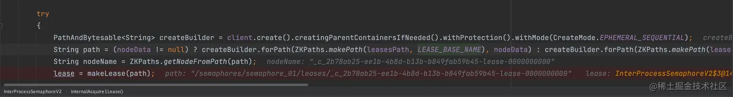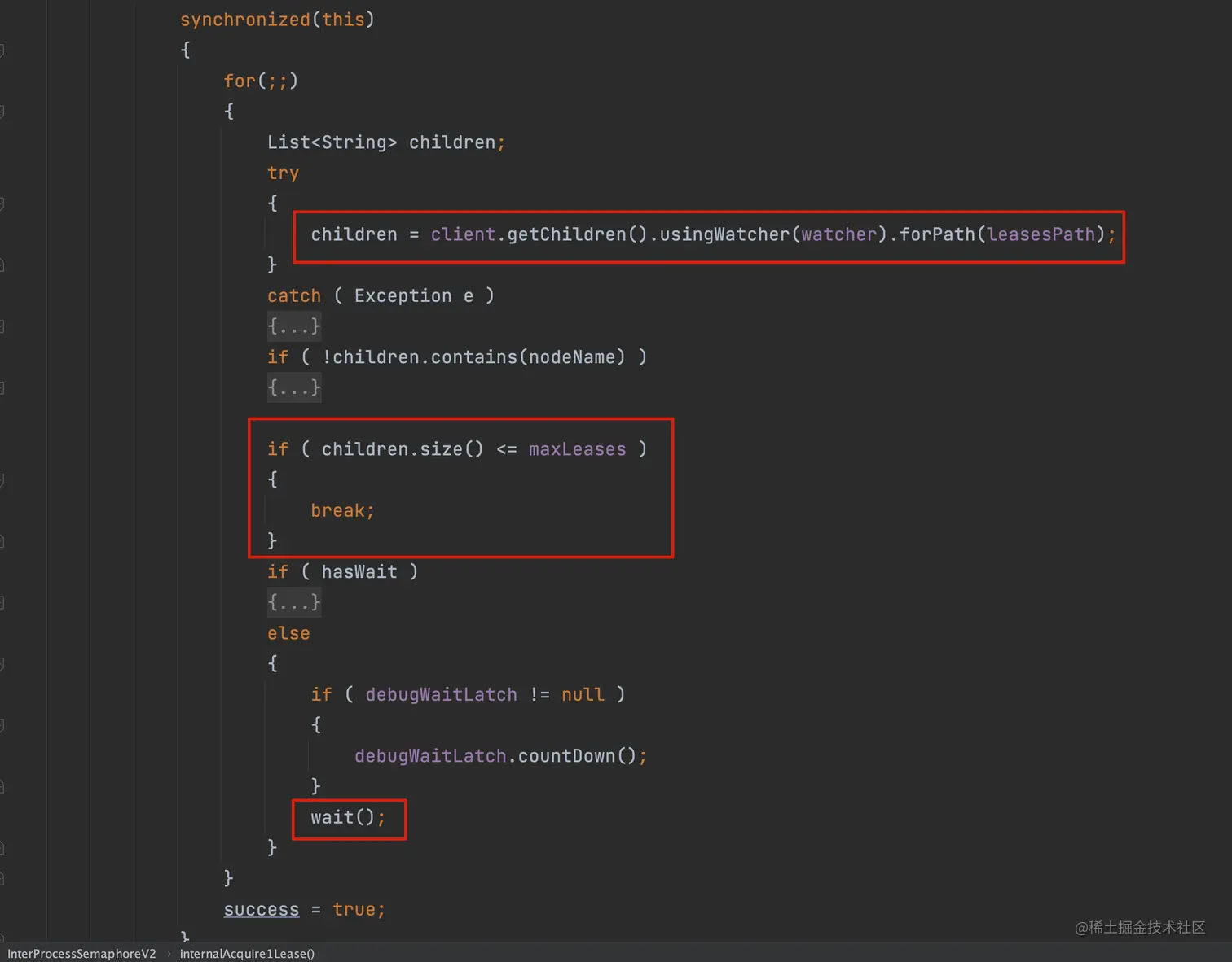 信号量 InterProcessSemaphoreV2 其实是通过判断节点下的子节点数量来实现控制信号量,同时内部加锁是基于可重入锁 InterProcessMutex 实现的。