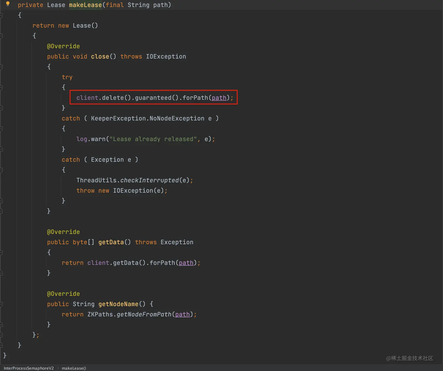 释放凭证就是调用 Lease 的 close 方法,删除节点,这样 /semaphores/semaphore_01/leases 上的监听器就会触发,然后其他线程获取凭证。