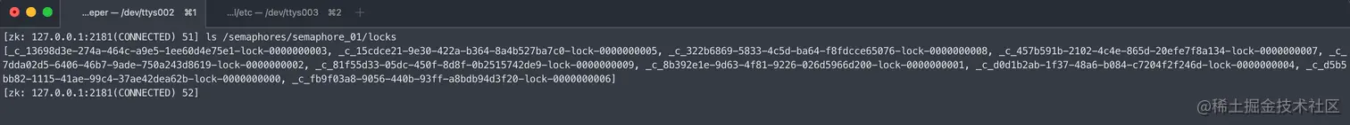 通过图也可以看出,使用 InterProcessSemaphoreV2 时,会先创建 /semaphores/semaphore_01 路径,并在路径下创建 locks 节点。也就是 /semaphores/semaphore_01/locks 路径下,有 10 个临时顺序节点。