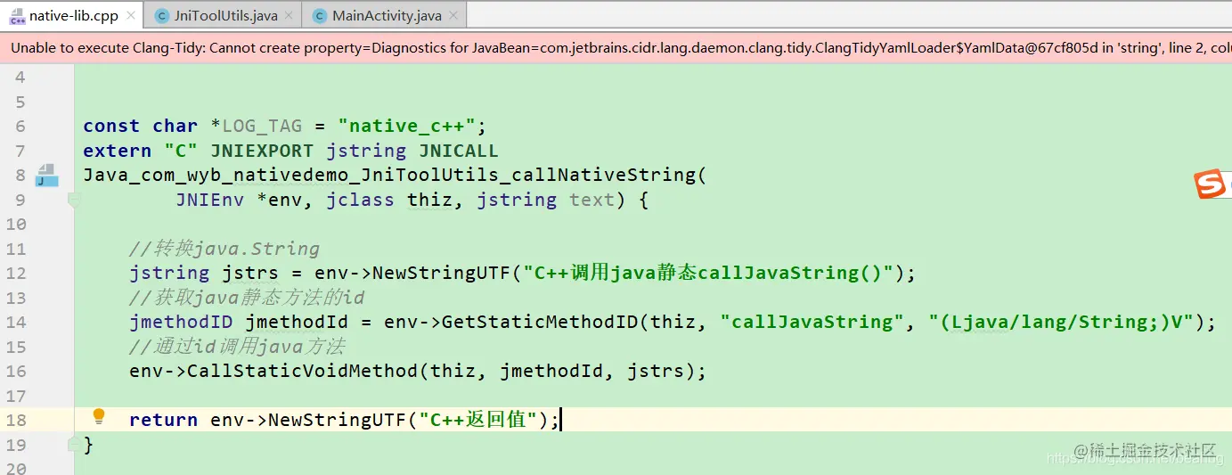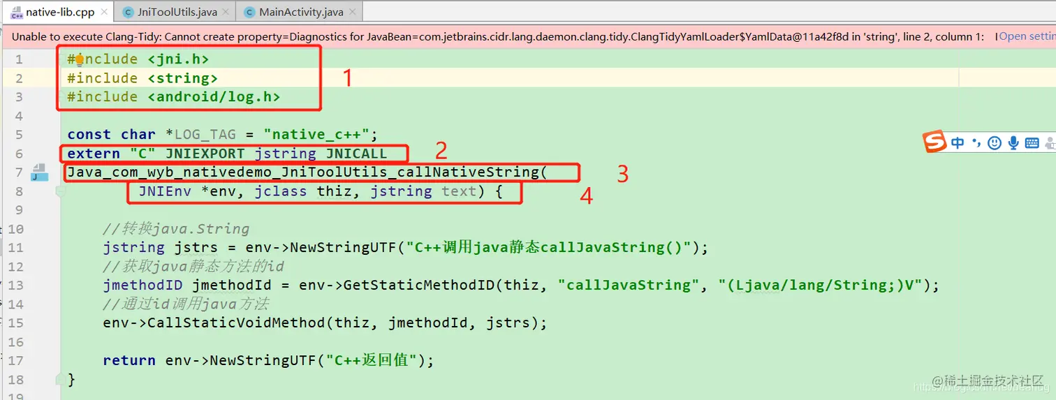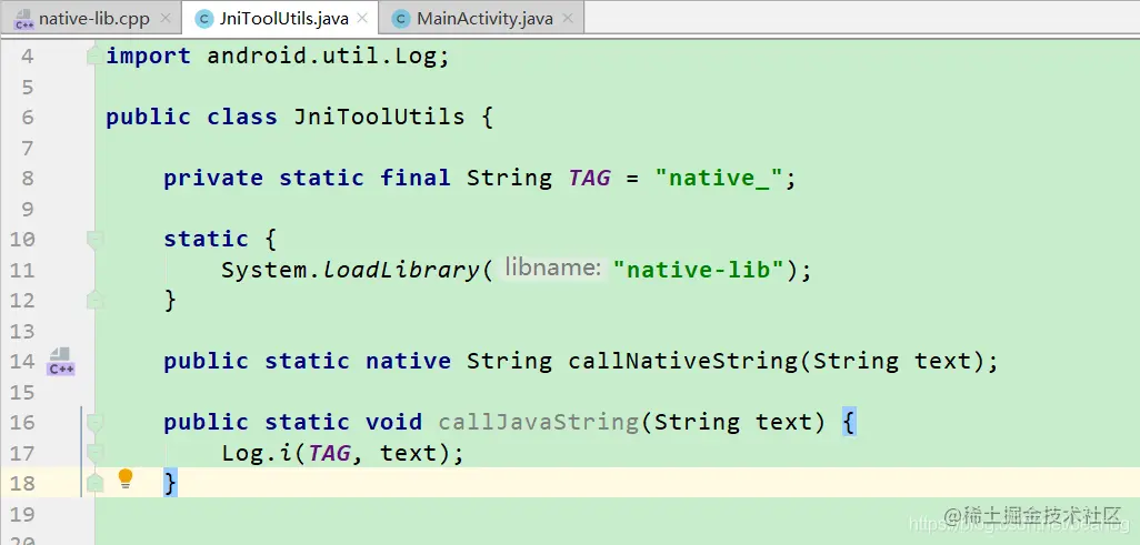 - java调用的c++方法需要使用"native"进行修饰,表示是一个本地方法,不需要进行实现.