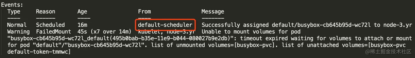 查看该 Pod 的事件列表可以发现 Kubernetes 的默认调度器把 Pod 调度到了 node-3.yr 故障节点,导致 PV 挂载超时;