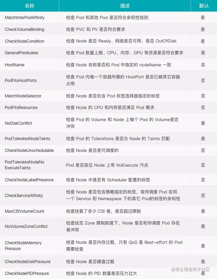 如果开启了 TaintNodesByCondition(从 1.12 开始为 beta级别,默认开启) 特性,则 CheckNodeCondition、CheckNodeMemoryPressure、CheckNodeDiskPressure、CheckNodePIDPressure 预选策略则会被禁用,PodToleratesNodeNoExecuteTaints、CheckNodeUnschedulable 则会启用。