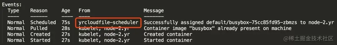 Pod 已经创建成功,并且没有部署到 node-3.yr 故障节点上,查看 Pod 事件列表可以发现,调度器已经不是 Kubernetes 的默认调度器了,而是 yrcloudfile-scheduler。