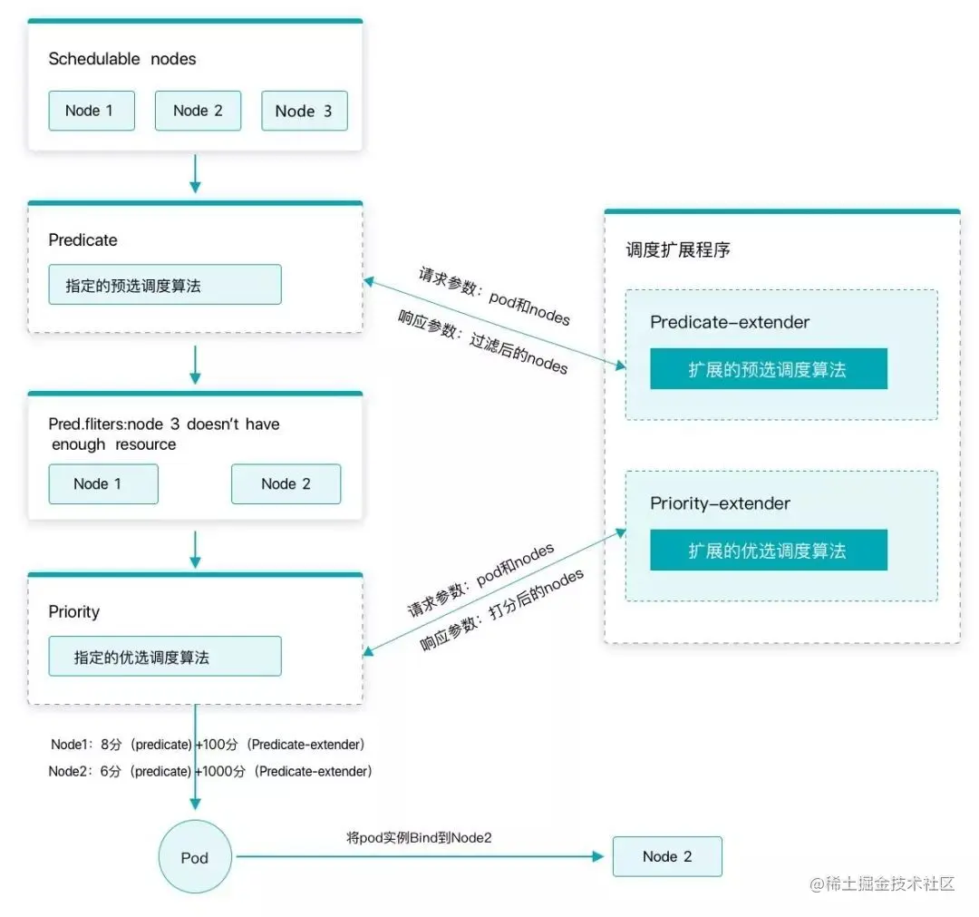扩展后的 Scheduler 会在调用内置预选策略和优选策略之后通过 HTTP 协议调用扩展程序再次进行预选和优选,最后选择一个合适的 Node 进行 Pod 的调度。调度流程如下: