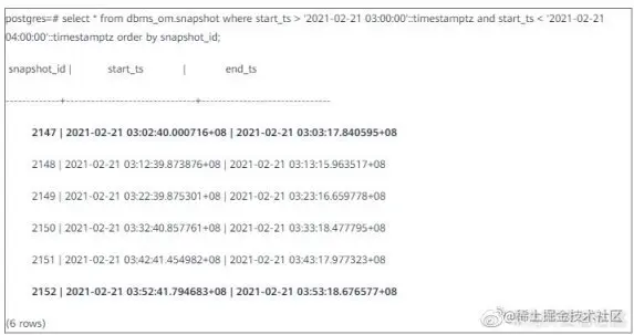 GaussDB(DWS)提供了系统函数 generate_wdr_report()用于创建 WDR 报告。生成报告前,首先需确定起止 snapshot_id。通过查询 dbms_om.snapshot 表格,针对感兴趣的时间段,取得两个时间点对应的 snapshot_id。例如,想查看 2021-02-21 03:00:00 和 2021-02-21 04:00:00 之间的性能状况: