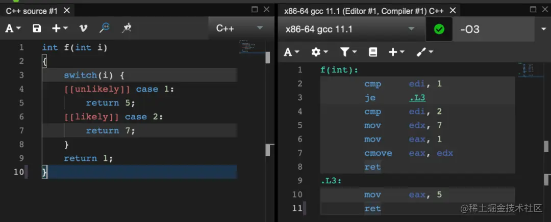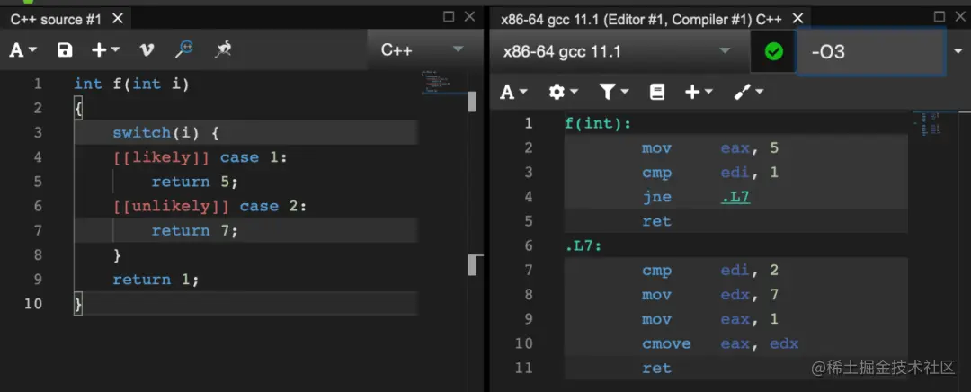 这次我们将优先级顺序调转,用属性标明case 2的是运行时更有可能走到的分支,那么对应的汇编代码中,我们看看case 1的逻辑:首先进来就和1比对,如果相等,跳转到.L3执行返回5的操作;如果不相等,那么直接和2比对,同时edx和eax寄存器分别赋值7和1,根据比对的结果确定是否将edx的值赋值到eax(cmove语句),然后返回。似乎上来还是优先比对了1的情况,但是仔细研究我们就会发现,在case 2的逻辑通路上是不存在跳转指令的,意味着case 2的流程也是需要跳转可以直接运行下去的,没有跳转处理器也就不需要清空流水线(此处简化理论,不涉及到处理器内部分支预测逻辑),case 2相对于case 1还是更加快速的流程,[[likely]]属性发挥了它应有的作用。