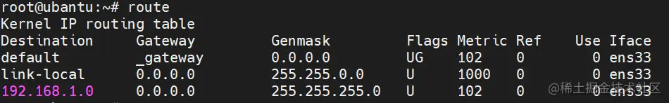网络地址和网络掩码共同确定本机可以达到的目的网络范围,通常情况下,目的网络范围包含以下几种情况: (1) 主机地址:某个特定主机的网络地址; (2) 子网地址:某个特定子网的网络地址; (3)默认路由:所有未在路由表中指定的网络地址,用0.0.0.0统一匹配,用于配置默认网关(ubantu虚拟机中默认路由显示为default)