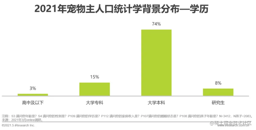 《2021年中国宠物消费趋势白皮书》显示,泛85后宠物主占比达到了74%,约有近5千万人,而这部分人群正是当前最重要的消费群体。更为重要的是,该报告指出,宠物主中本科率超过7成,家庭月收入在1.5w以上的宠物主比例在72%。