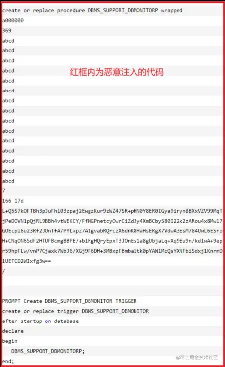 将代码复制进墨天轮****平台解析后,得知被注入的恶意代码核心部分是一个触发器,会删除所有tab$