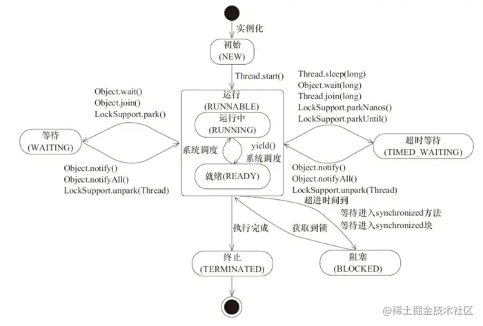 此图来源于《JAVA并发编程的艺术》一书中,线程是会在不同的状态间进行转换的,java线程线程转换图如上图所示。线程创建之后调用start()方法开始运行,当调用wait(),join(),LockSupport.lock()方法线程会进入到**WAITING**状态,而同样的wait(long timeout),sleep(long),join(long),LockSupport.parkNanos(),LockSupport.parkUtil()增加了超时等待的功能,也就是调用这些方法后线程会进入**TIMED_WAITING**状态,当超时等待时间到达后,线程会切换到Runable的状态,另外当WAITING和TIMED _WAITING状态时可以通过Object.notify(),Object.notifyAll()方法使线程转换到Runable状态。当线程出现资源竞争时,即等待获取锁的时候,线程会进入到**BLOCKED**阻塞状态,当线程获取锁时,线程进入到Runable状态。线程运行结束后,线程进入到**TERMINATED**状态,状态转换可以说是线程的生命周期。另外需要注意的是: