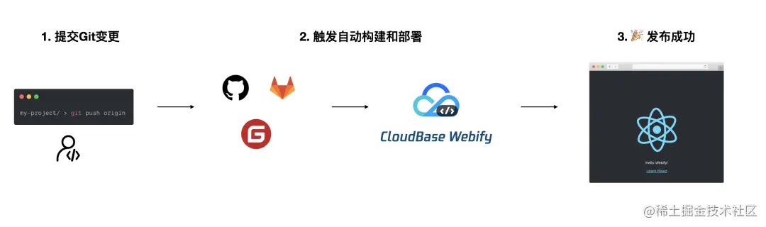 在 CloudBase Webify 中,每个应用都可以与一个 Git 代码仓库绑定。绑定后,代码仓库上相应分支的任何提交,都会触发应用的构建及部署。