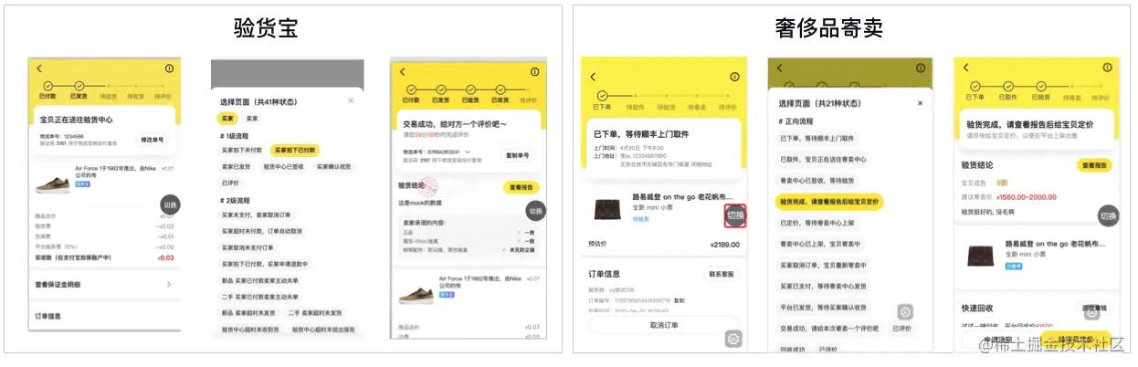 当将以上所述的整套方案串联完成后,业务侧开发只需要定义好属于自己订单详情的状态枚举数据结构,并将视图层组件和mock层插件引入项目工程,即可接入mock的能力,实现所选即所得的订单状态变更。 目前该方案已经在闲鱼验货宝、奢侈品寄卖等交易链路场景下接入, 从真实使用过程中,能够有效提升开发联调的效率,单次状态的切换时间成本从分钟级别下降到秒级, 并能帮助测试和视觉同学快速回归业务场景,定位线上问题,简单的视觉问题不再依赖于后端接口的状态切换,约能节省30%以上的联调沟通成本。 另外带来的彩蛋是该方案的切换语义特点, 在项目开发人员出现流动时,新承接人能够通过这一mock方式快速地理解业务,上手开发。上手快,所见即所得,算是针对此类页面维护开发的一门利器。