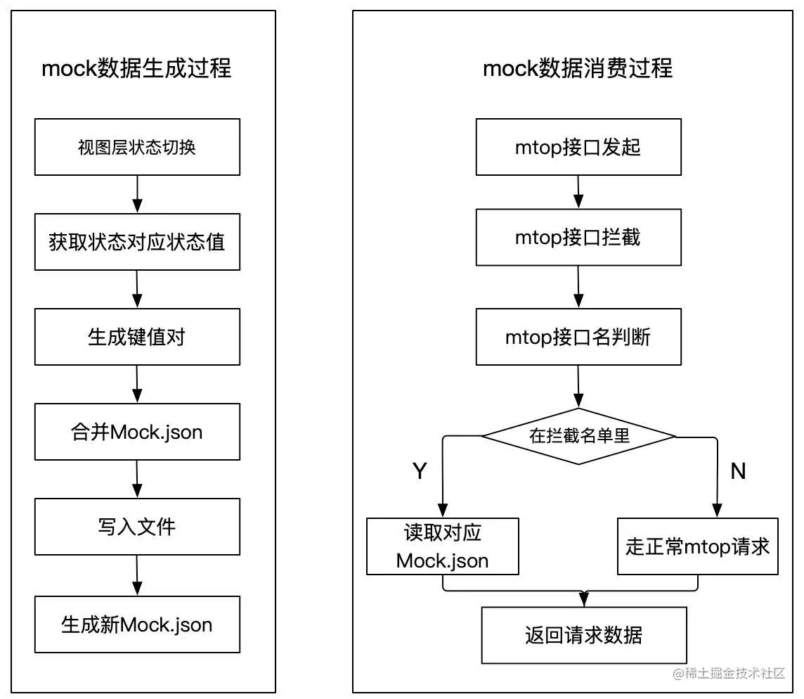 如下图所示,mock层既要更新视图层切换状态而组成新的mock.json, 也要拦截页面侧发起的mtop网络请求定向到对应的mock.json文件;