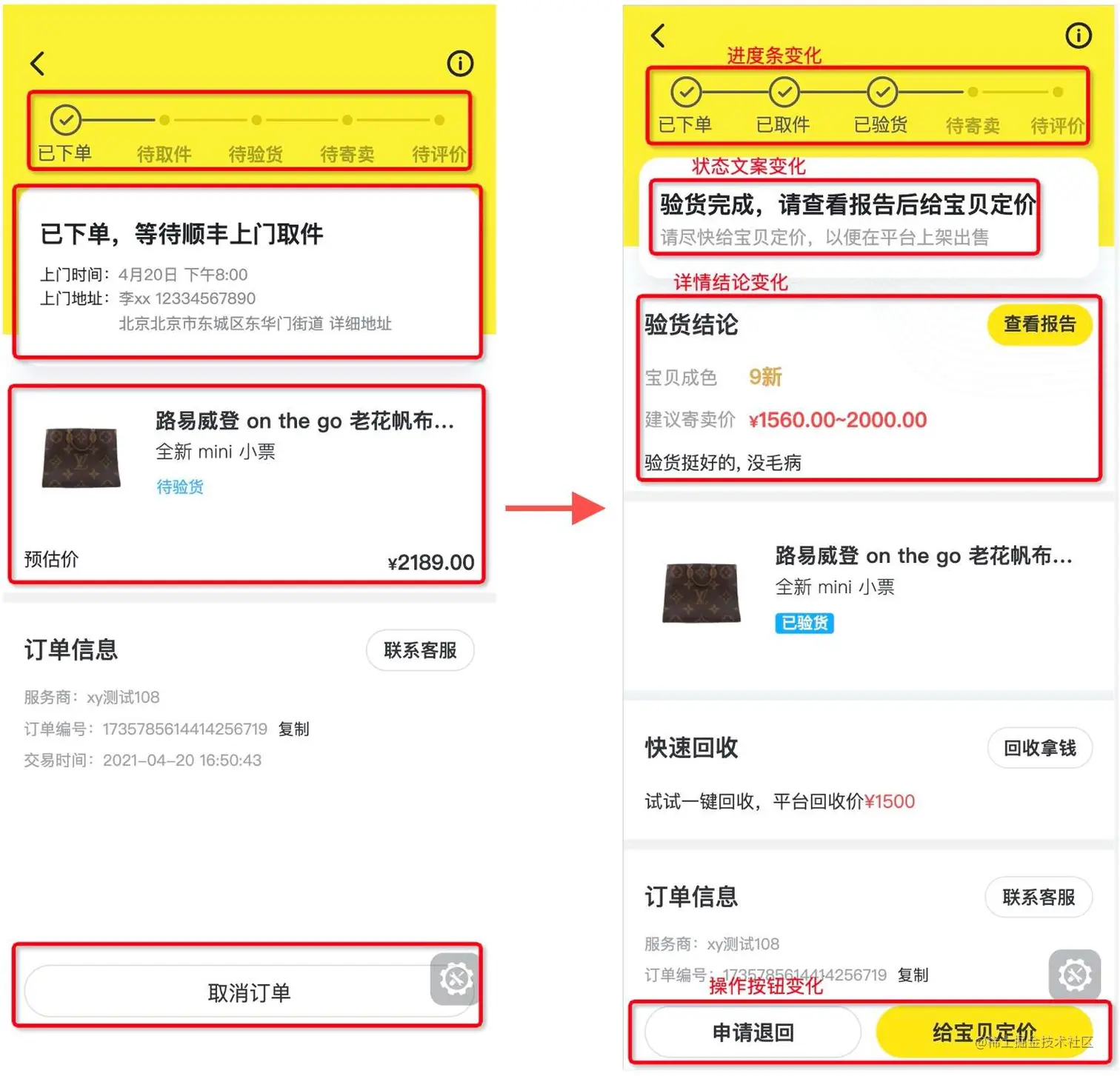 闲鱼作为国内最大的二手交易电商平台,有着验货宝/省心卖/优品等有着闲鱼特色的交易链路,而作为交易链路的闭环,一旦形成有效订单,就会有对应的订单详情页,订单详情页往往承载着复杂的交易状态的变化。以验货宝为例, 验货宝是闲鱼推出针对二手商品存在的质量/真伪的不确定性,提出的先验货后交易模式。 作为交易订单节点: **就有买家拍下->付款->卖家发货->鉴定方收货->鉴定为真->发货给买家->买家收货 **等多个交易节点,一个订单详情页在不同流转状态下可能存在数十种细分状态,每种状态之间存在着有着文案/操作按钮/进度条等视觉交互上的差别, 如下图所示: