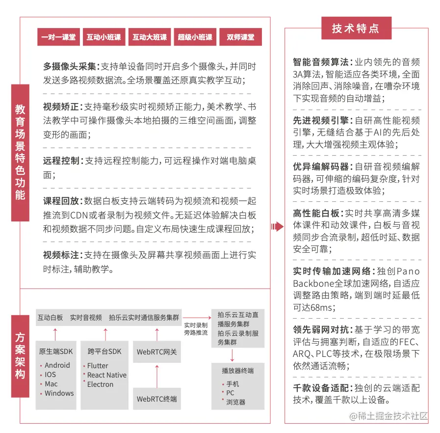 同时,拍乐云在业内率先提出音视频「两高一低」的概念(即:高质量、高流畅、低时延),希望通过技术升级让更多的客户应用从“能用”过渡到“好用”。拍乐云汇聚了一大批专注于音频、视频、网络、AI等领域的资深技术专家,在服务客户场景的过程中非常注重技术创新,打磨出多摄像头采集、视频矫正、远程控制、视频标注等多个音视频特色功能,并支持万人单房间、千人音视频同时连麦,可实现99.95%的高可用,为用户打造极致的互动体验,提供更优质、更专业的教育场景化音视频服务。