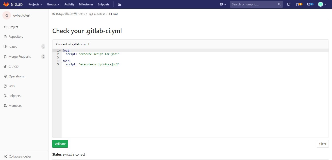 GitLab CI的每个实例都有一个名为Lint的嵌入式调试工具,它可以验证.gitlab-ci.yml文件的内容,进入项目仓库->CI/CD->CI Lint,示例如下: