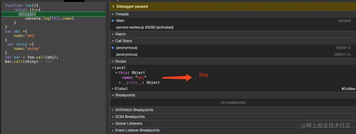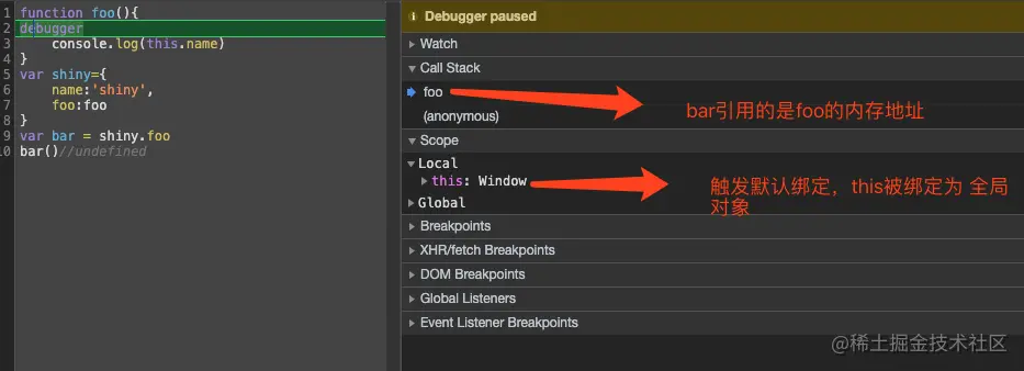 第一行代码跟平常一样调用了 object.getName(),返回的是"My Object",因为 this.name 就是 object.name。第二行代码在调用这个方法前先给它加上了括号。虽然加上括号之后,就好像只 是在引用一个函数,但 this 的值得到了维持,因为 object.getName 和(object.getName)的定义 是相同的。第三行代码先执行了一条赋值语句,然后再调用赋值后的结果。因为这个赋值表达式的值是 函数本身,所以 this 的值不能得到维持,结果就返回了"The Window"。 当然,你不大可能会像第二行和第三行代码一样调用这个方法。不过,这个例子有助于说明即使是 语法的细微变化,都有可能意外改变 this 的值。