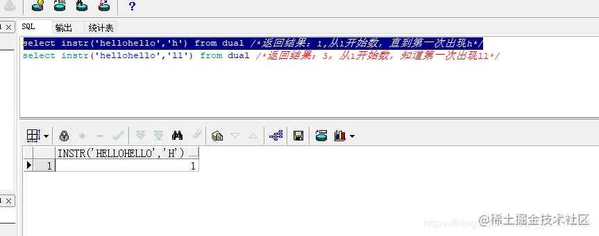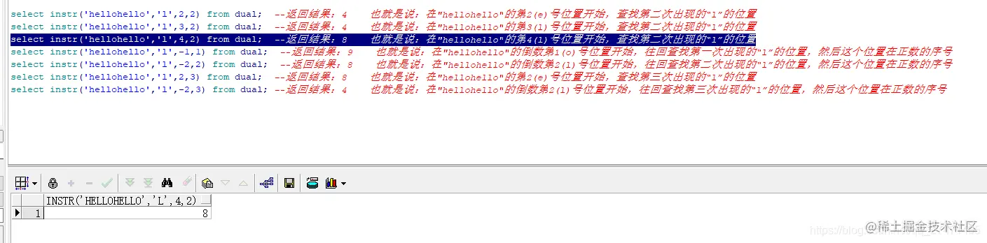 select instr('hellohello','ll') from dual /*返回结果:3,从1开始数,知道第一次出现ll*/