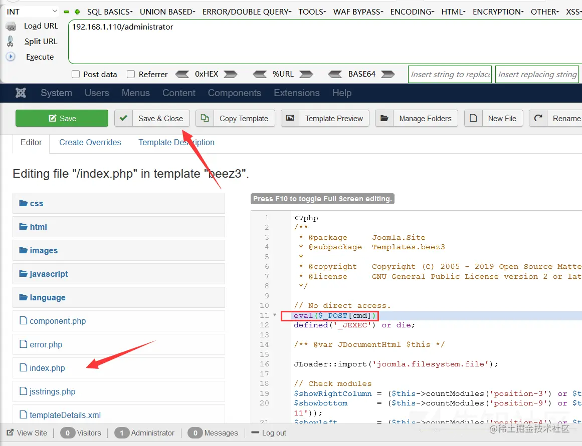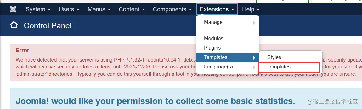 这里经过谷歌后发现,joomla的后台有一个模板的编辑处可以写入文件,这里找到Extensions->Template->Templates