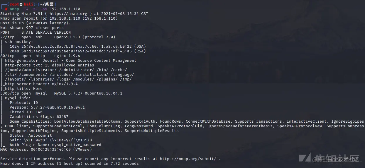 这里首先访问下80端口,发现为joomla框架,joomla框架在3.4.6及以下版本是有一个远程rce漏洞的,这里先使用exp直接去打一下
