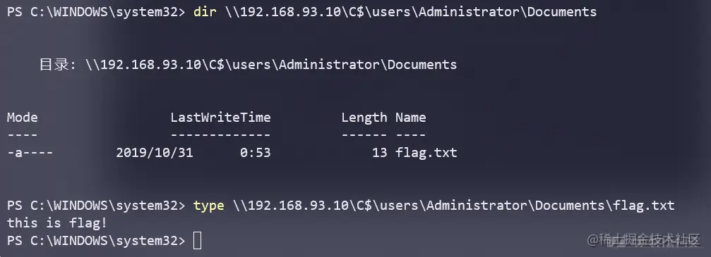 dir \\\192.168.93.10\\C$\\users\\Administrator\\Documentstype \\\192.168.93.10\\C$\\users\\Administrator\\Documents\\flag.txt