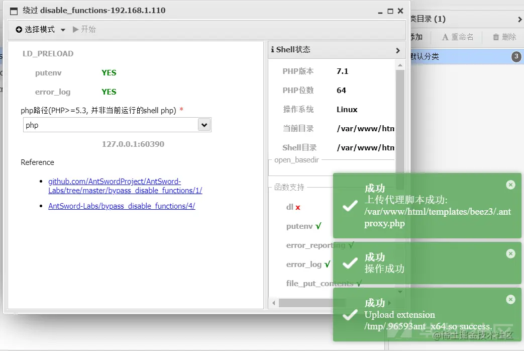 这里为了方便我直接使用的是蚁剑里自带的插件绕过disable_functions,可以看到已经上传脚本操作成功了