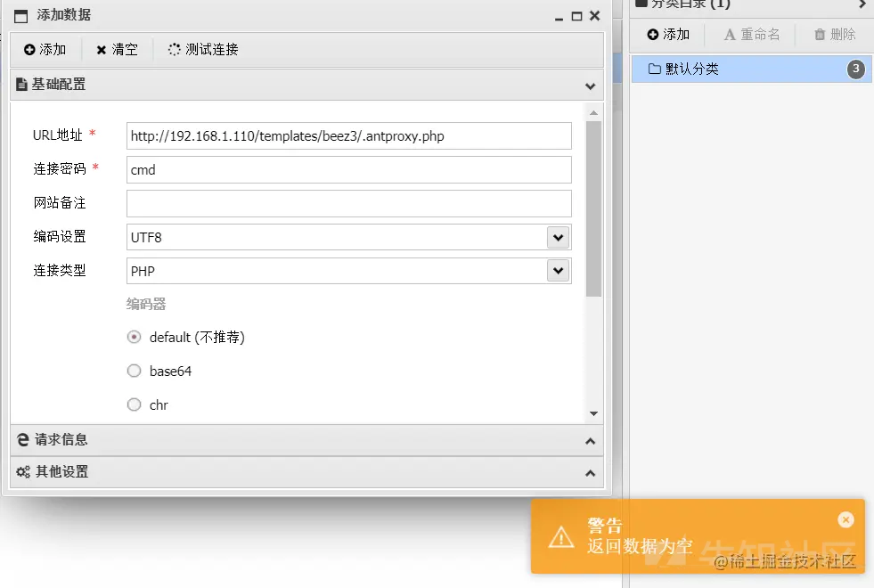 这里我直接去连接上传的这个.antproxy.php,这里理论上是应该用原来的密码连接过去就可以执行命令了,但是这和地方不知道为什么返回数据为空我淦!