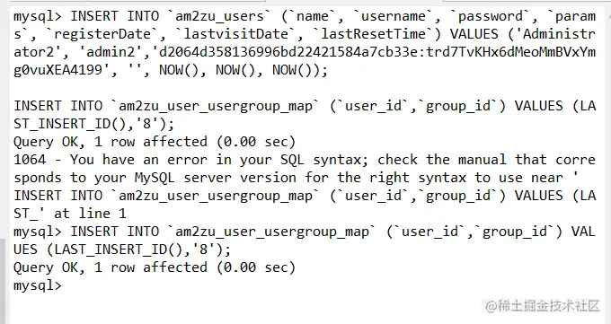 在navicat中执行sql语句,注意这里要分开执行两个INSERT INTO否则回报错,这里相当于我们添加了一个admin2 secret这个新的超级管理员用户