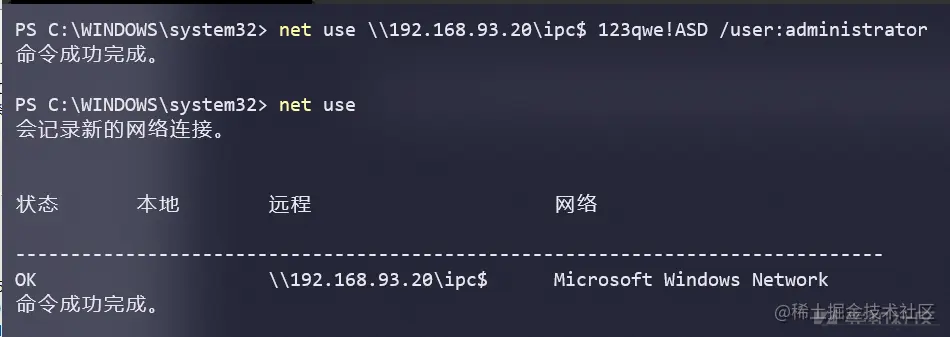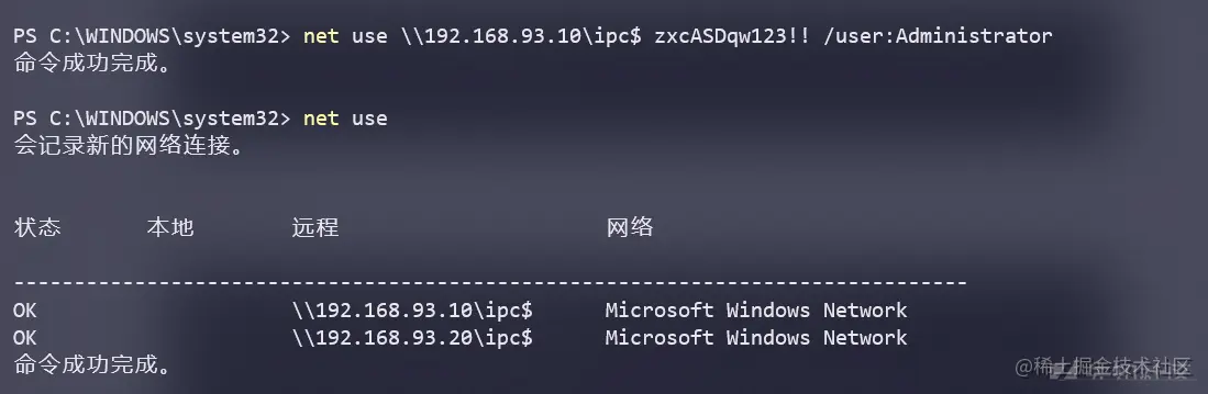 那么这里也直接使用ipc连接直接连接10这台主机,即TEST这个域的域控,可以看到已经连接成功了