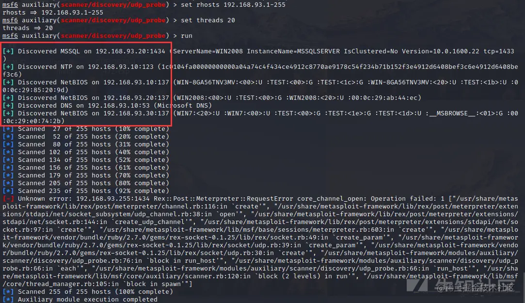 这里可以使用proxychain + nmap进行扫描,这里为了方便我就直接使用msf中的模块对192.168.93.0/24这个网段进行扫描了。注意这里在实战的时候可以适当把线程调小一点,不然流量会很大,这里因为是靶场的原因我就直接调成了20