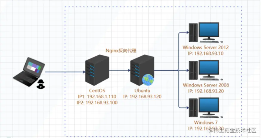 那么到这里已经很明显了,也就是说我们之前拿到的那台linux的192.168.1.0/24这个网段相当于一个公网IP,但是真正的主机应该是192.168.93.0/24,但这个是一个内网网段,所以说最符合这种情况的就是nginx反向代理