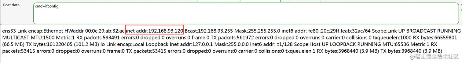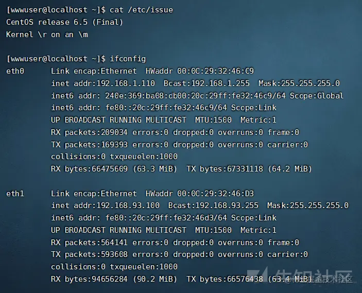看一下主机和ip情况,可以发现这台主机已经不是我们之前的那台Ubuntu了,而是CentOS,而且双网卡,一张网卡是我们之前扫描时候得出的1.0/24这个网段的ip,还有一个ip就是93.0/24这个内网网段的ip,那么这台linux主机就是Ubuntu的反向代理主机无疑了