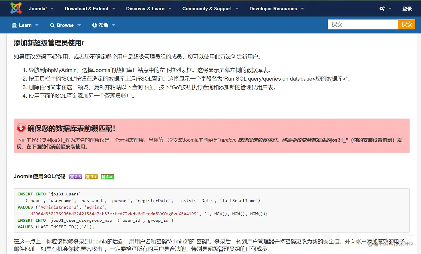 在搜索的时候发现joomla官网虽然没有直接公布密码的加密方式,但是它为了防止用户忘记密码增加了一个添加超级管理员用户的方式,就是通过登录数据库执行sql语句达到新建超级管理员的效果