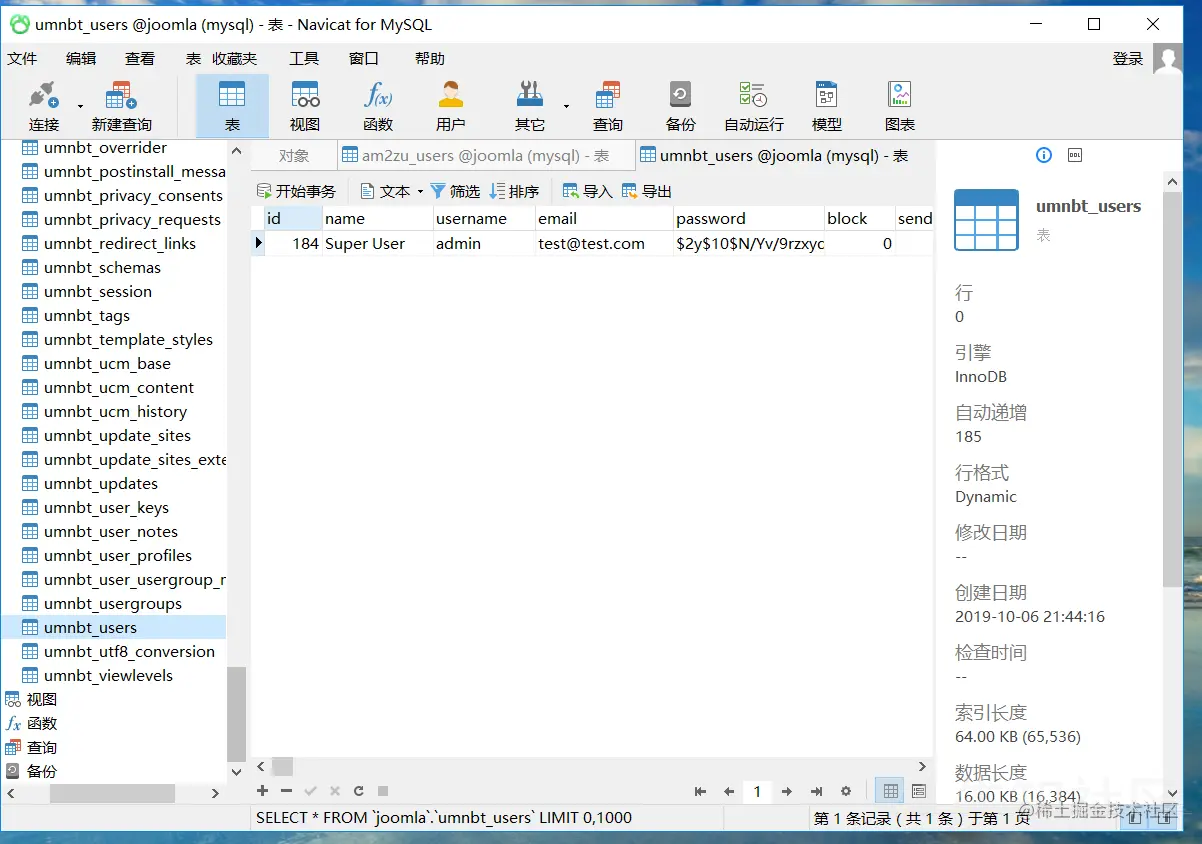 然后就是翻数据找管理员的帐号了,找管理员帐号肯定是找带有user字段跟password字段的,这里我找了一段时间,最后发现umnbt_users这个表跟管理员帐号最相似,但是这里出现了一个问题,我发现password这个地方的密码不是明文