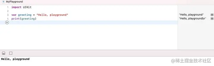 点击代码左侧运行按钮,Playground的控制台和右侧区域均输出了变量的值。在Playground里面可以定义函数,定义类等等,Swift相关语法都可以尝试。