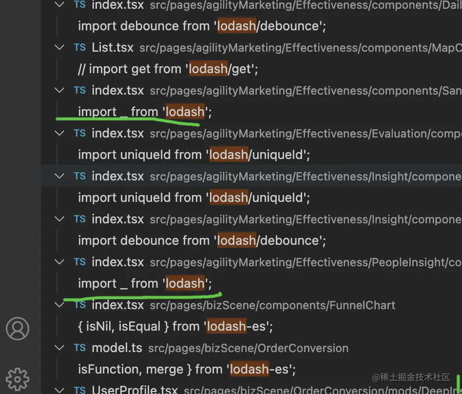 在我目前的项目中,可以看到,由于规范的不统一,确实出现了各种各样的使用方式,在优化后我们统一采用按需使用或者使用支持tree-shaking的lodash-es
