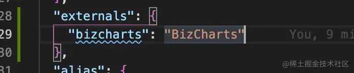 可以看到,项目中占体积较大的是Bizcharts以及monaco-editor。对于Bizcharts我决定采用将其移出构建范围,采用直接用umd版本的cdn进行引入。在我们的项目中,可以配置build.json中的externals选项,它可以将某些 import 的包排除在 bundle 之外,在运行时再去外部获取这些依赖。 比如,从 CDN 引入 React 资源,而不是将它打包,详细配置同 webpack 的externals