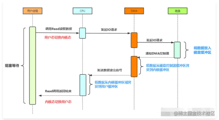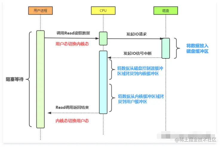 - 用户进程向 CPU 发起 read 系统调用读取数据,由用户态切换为内核态,然后一直阻塞等待数据的返回;