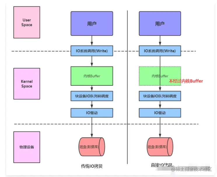用户态直接 I/O 使得应用进程或运行在用户态(user space)下的库函数直接访问硬件设备,数据直接跨过内核进行传输直接从用户态地址空间写入到磁盘中,内核在数据传输过程除了进行必要的虚拟存储配置工作之外,不参与任何其他工作,这种方式能够直接绕过内核,极大提高了性能。对于一些应用程序,例如:数据库。他们更倾向于自己的缓存机制,这样可以提供更好的缓冲机制提高数据库的读写性能。