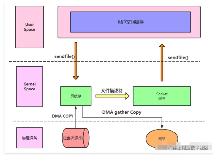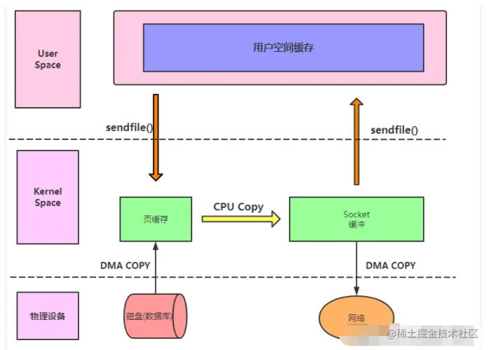 通过 sendfile 系统调用,数据可以直接在内核空间内部进行 I/O 传输,从而省去了数据在用户空间和内核空间之间的来回拷贝。与 mmap 内存映射方式不同的是,sendfile 调用中 I/O 数据对用户空间是完全不可见的。也就是说,这是一次完全意义上的数据传输过程。