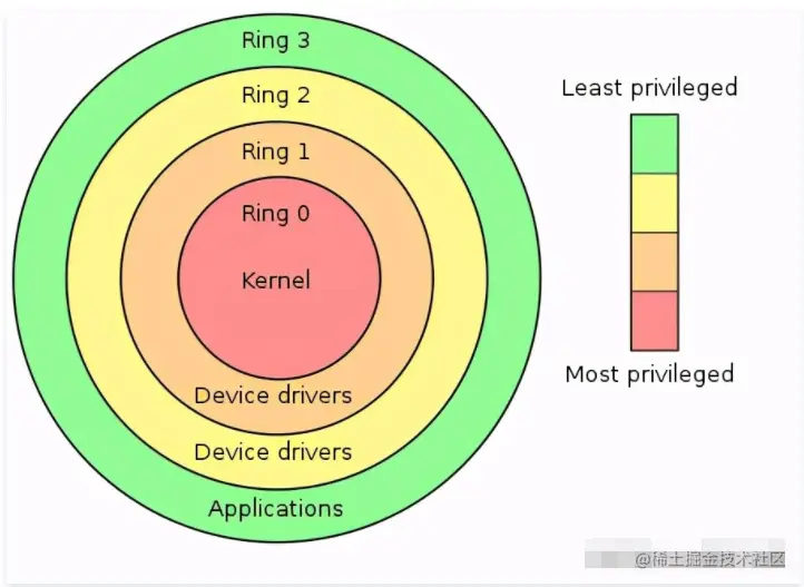 Linux 按照特权等级,把进程的运行空间分为内核空间和用户空间,分别对应着下图中, CPU 特权等级分为4个,Linux 使用 Ring 0 和 Ring 3。